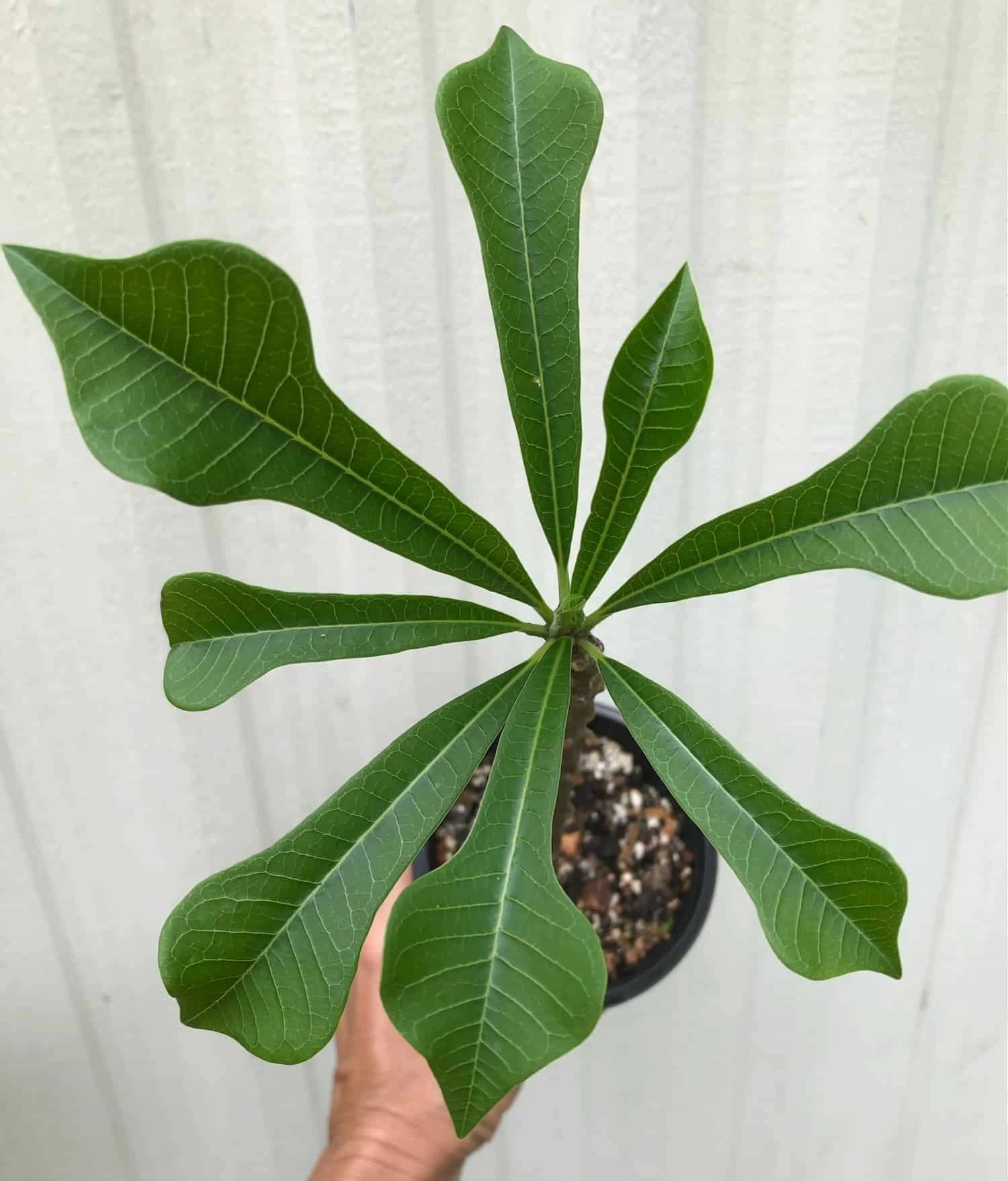 An attractive and exotic, deciduous foliage plant, with large, shiny green leaves, which is best known for its showy clusters of waxy flowers produced over a long period which have a delicious and intense fragrance. Sometimes called ‘Temple Trees’, the Frangipani is grown throughout the tropics, and in Hawaii their long-lasting flowers are used in Leis.