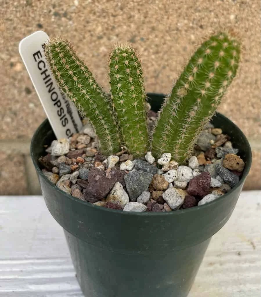 Echinopsis chamaecereus aka Peanut Cactus is native to Argentina and is a branched cactus with many crowded pale green finger-like stems. Stems are up to 6 inches long and up to 0.5 inches (1.2 cm) in diameter. They have 8 to 10 ribs and 10 to 15 soft white bristles per areole. Flowers are orange-red or fusia and up to 2 inches in diameter. Several flushes of flowers appear from late spring to early summer.