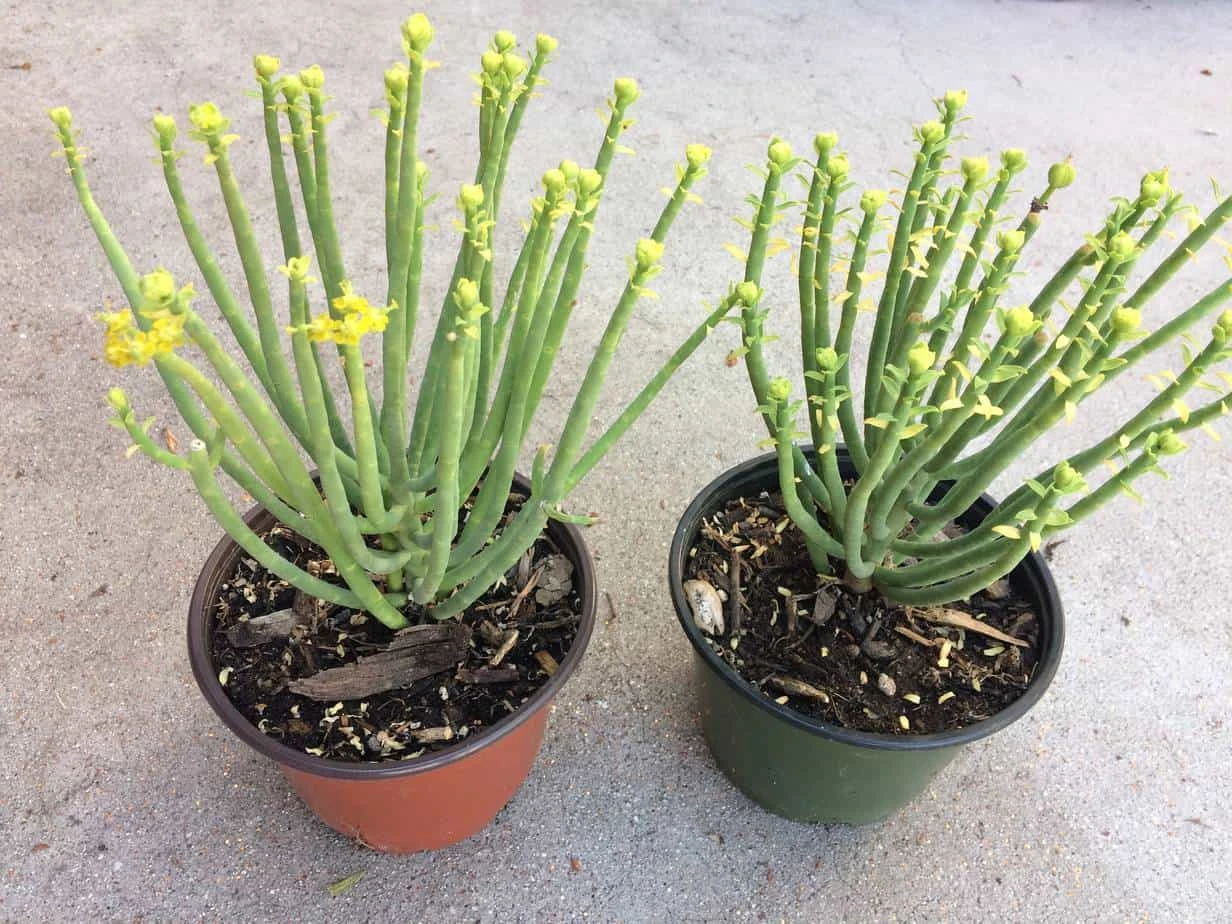 The Euphorbia Mauritanica or Pencil Milk Bush is a pencil-like, branching plant with upright, bright green, cylindrical stems that sprout in the shape of a small shrub. Its small leaves will grow along the grayish green stem. The clumping, low-growing plant grows eighteen to twenty-four inches tall. In warmer climates, in late winter, it produces a yellow flower at the end of each young branch. It is heat and drought-tolerant, but likes additional water during the hot summer. Do not over-water this succulent because it will rot. Plant it in full sun to partial shade. It is hardy into to the mid to high twenties Fahrenheit. When the plant stems are broken or pruned, it produces milky-white latex that may cause an allergic reaction if it comes in contact with skin. This succulent is extremely brittle and can break easily. Handle it with care when planting or transplanting. Use it in colorful containers and raised planters or as a foundation plant. It can also be used in groups or rock gardens mixed with other cacti and low-water-use plants. When planting it in masses, space it four to six feet apart. It is native to the Northern, Western, and Eastern Capes and KwaZulu-Natal in South Africa, where it grows extensively in dry valleys and along hillsides.