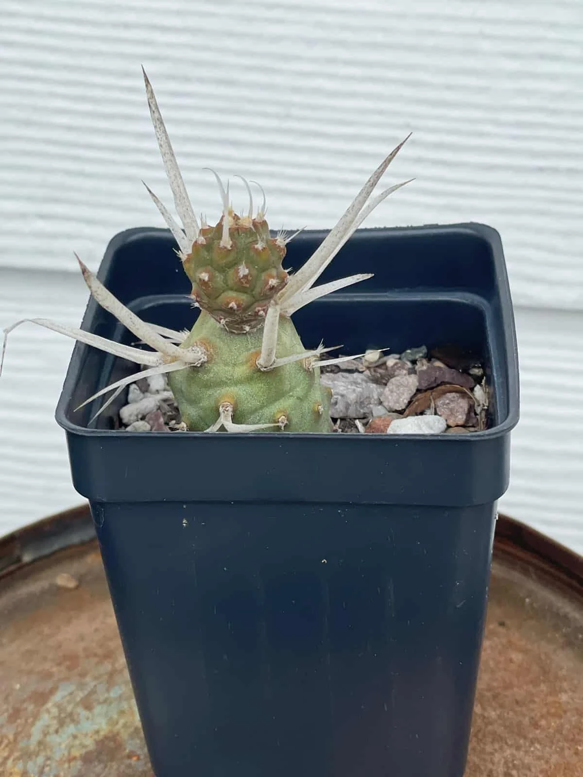 Tephrocactus articulatus var papyrocanthus is endemic of western Argentina. It is commonly known as Paper Spine Cactus, Paper Spine Cholla Cactus. Is a segmented bushy succulent slowly growing up to up to 30 cm, it is the typical form of a group of variety. It develops in little pine-cone shaped segments that are loosely attached to each other and fall easily and it has broad, raffia like, conspicuous , flattened spines which are not spines but thin ribbon like processes, and vary much as to their color, markings, and length. Blooms are either white or yellow. The white flowers make a nice contrast to the earth-tone colors of the plant. 1 to 5 cm long fruit is brown. It is fairly cold resistant and hardy to 15°F. Needs full sun, (with insufficient illumination stems get thinner as a result of the lack of sun) The main growing period is spring. It might produce some new segments in the autumn too. Needs good drainage. Plant will ship bare root.