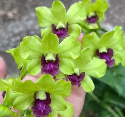 Dendrobium Green star Produces golden yellow colored massive flowers with an attractive texture. It has a purple lip, which attracts everyone with contrasting colors.