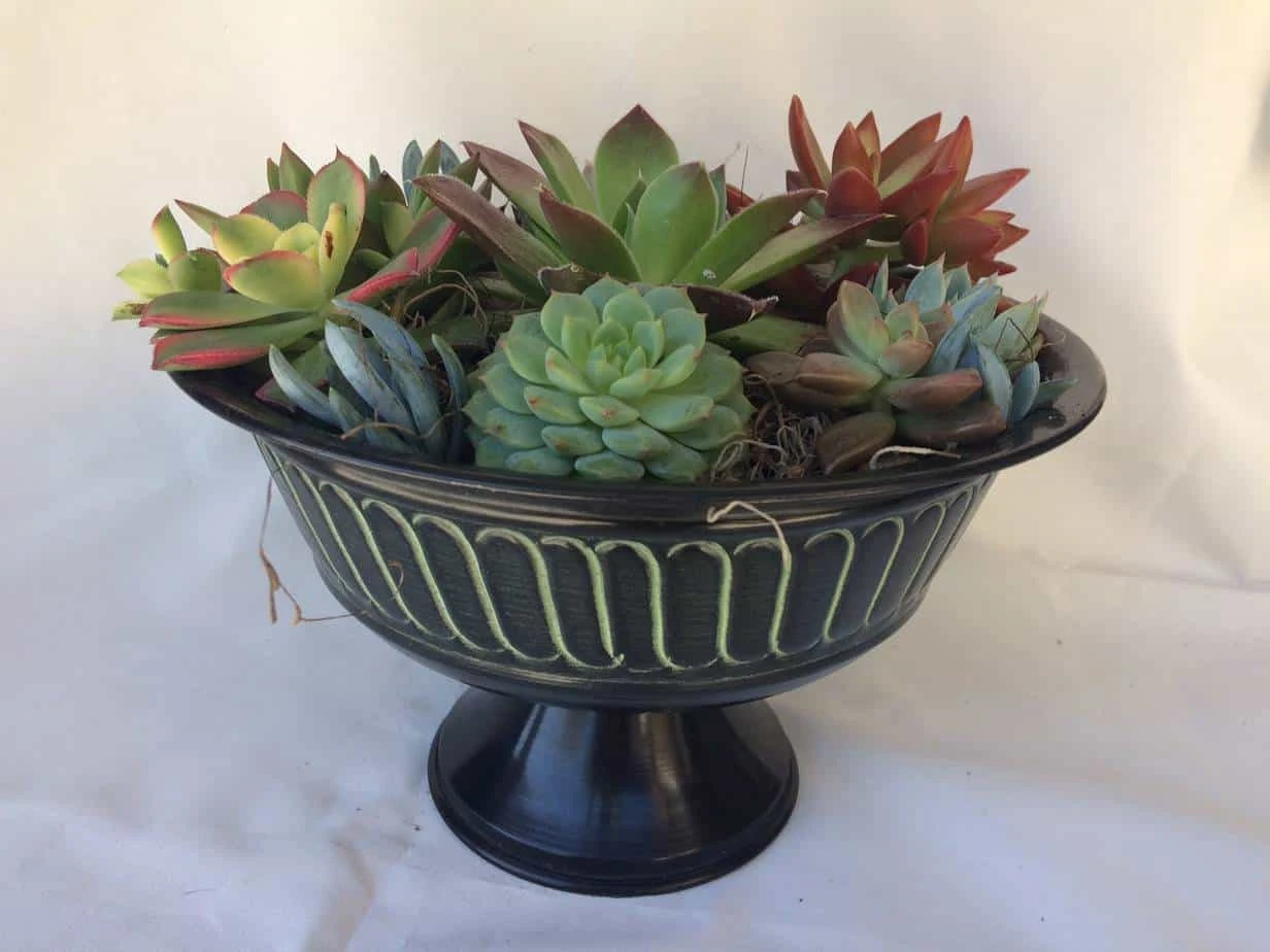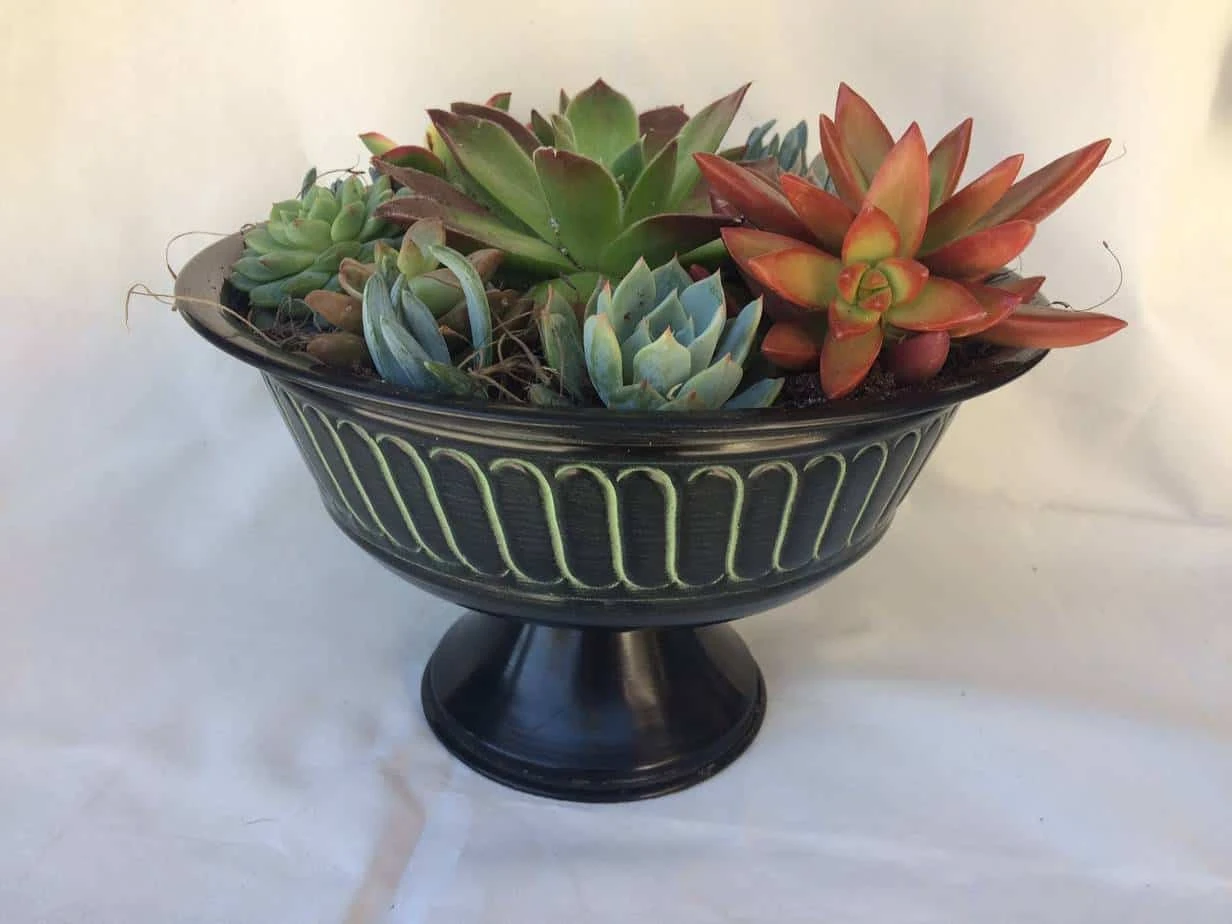 This is a beautiful large, complete arrangement done in a Black with Green Tin Pedestal Planter. The planter is 5″ tall with a 7″ diameter planting area. It is a combination of bright and colorful plants. It is complete and arrives completely assembled, as shown.