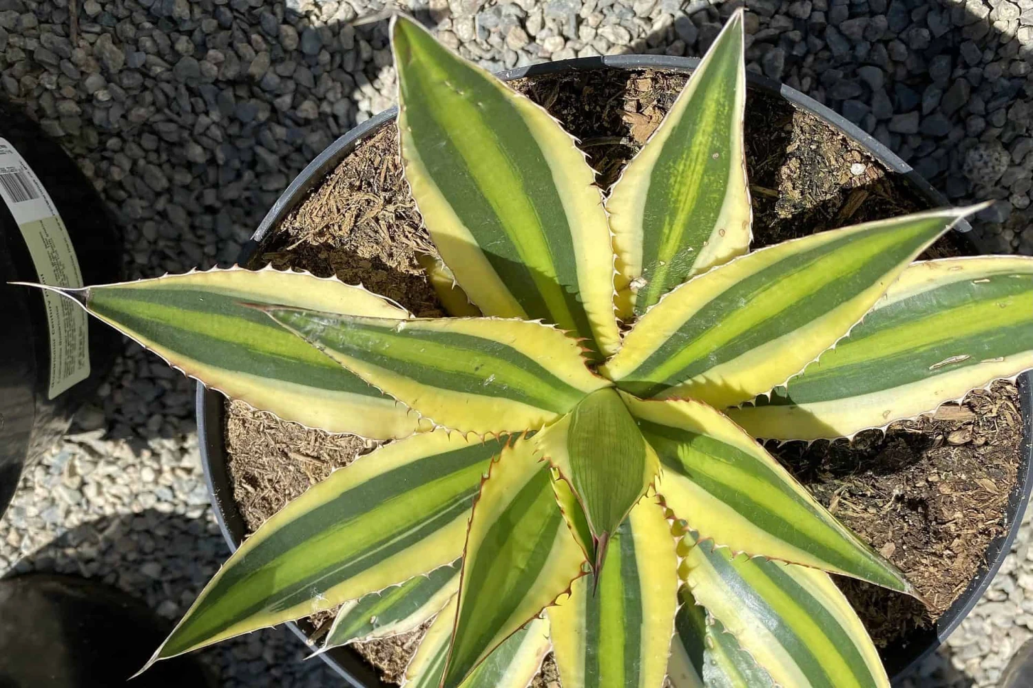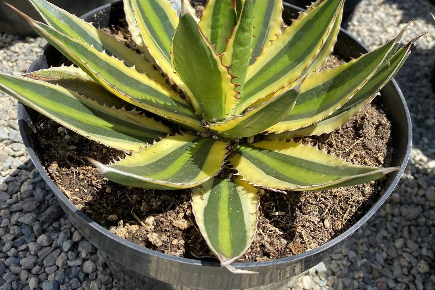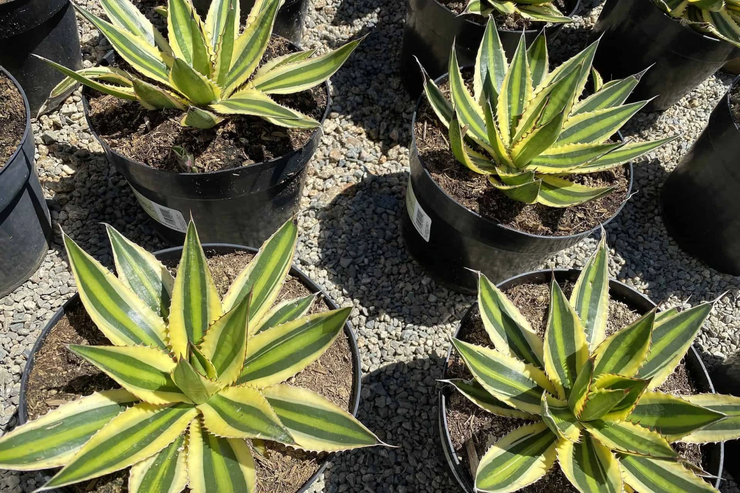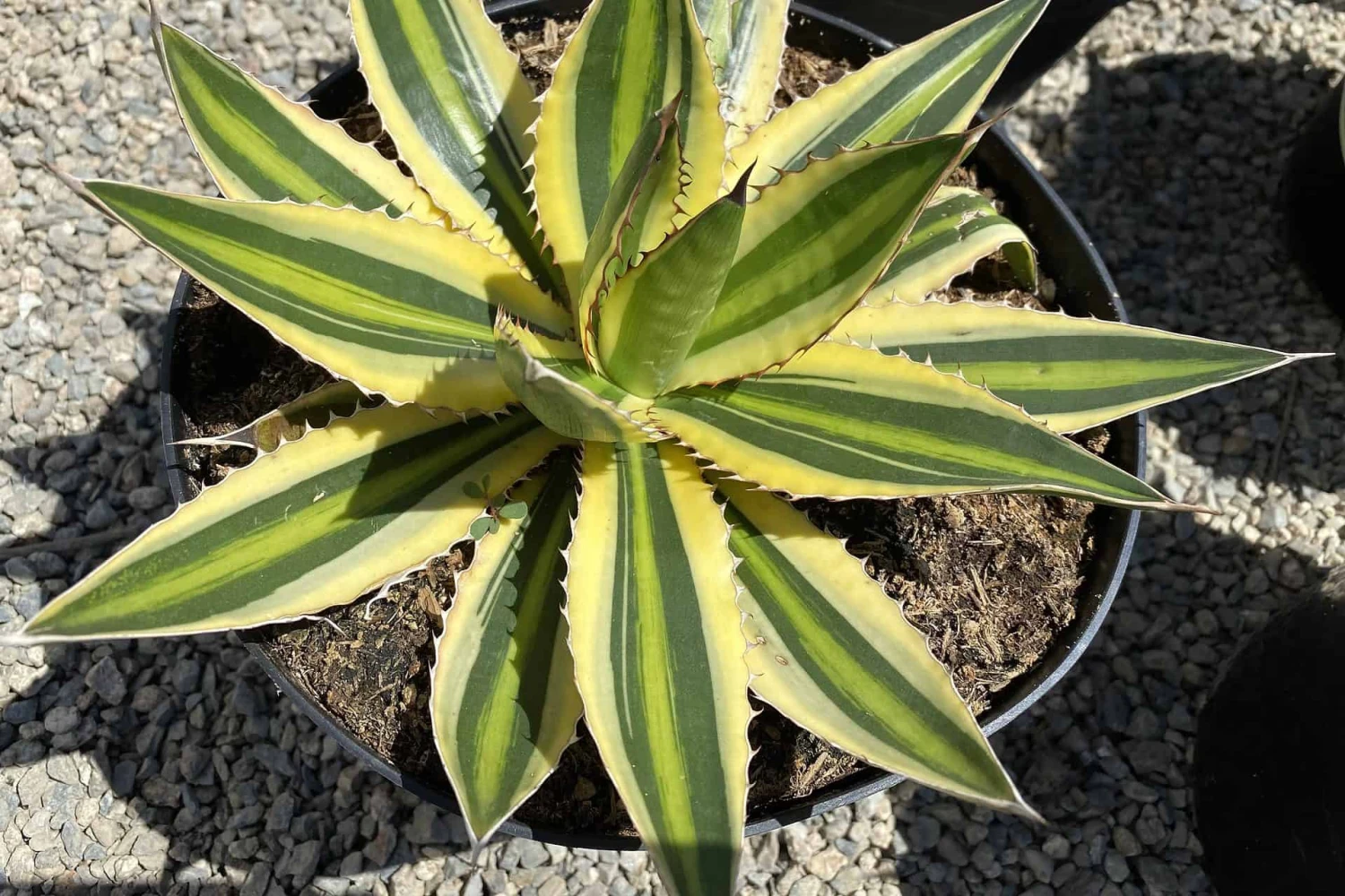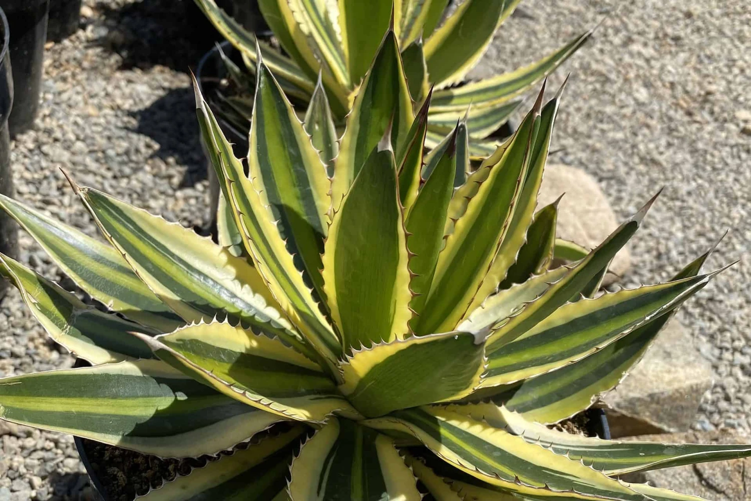 The Mature Agave lophantha ‘Quadricolor’ is an amazing plant. It boasts a stunning array of complimentary colors. It is botanically known as a Mexican Agave lophantha. It has wide leaves, with a chartreuse/yellow center that is edged in green with a pale green margin. This margin is  surrounded by a very striking white border, which is why it is known the ‘Quadricolor’. The Agave lophantha ‘Quadricolor’ makes an eye catching specimen as a container plant or in the ground. It offsets frequently to form new plants, or as a lovely base around the mother plant. It produces flowers that attract hummingbirds. This is a rare and hard to find Agave.