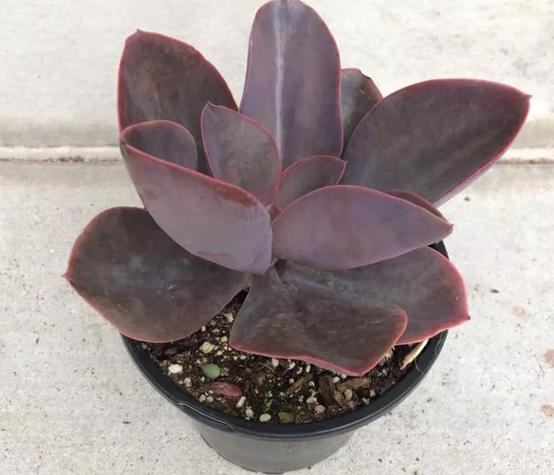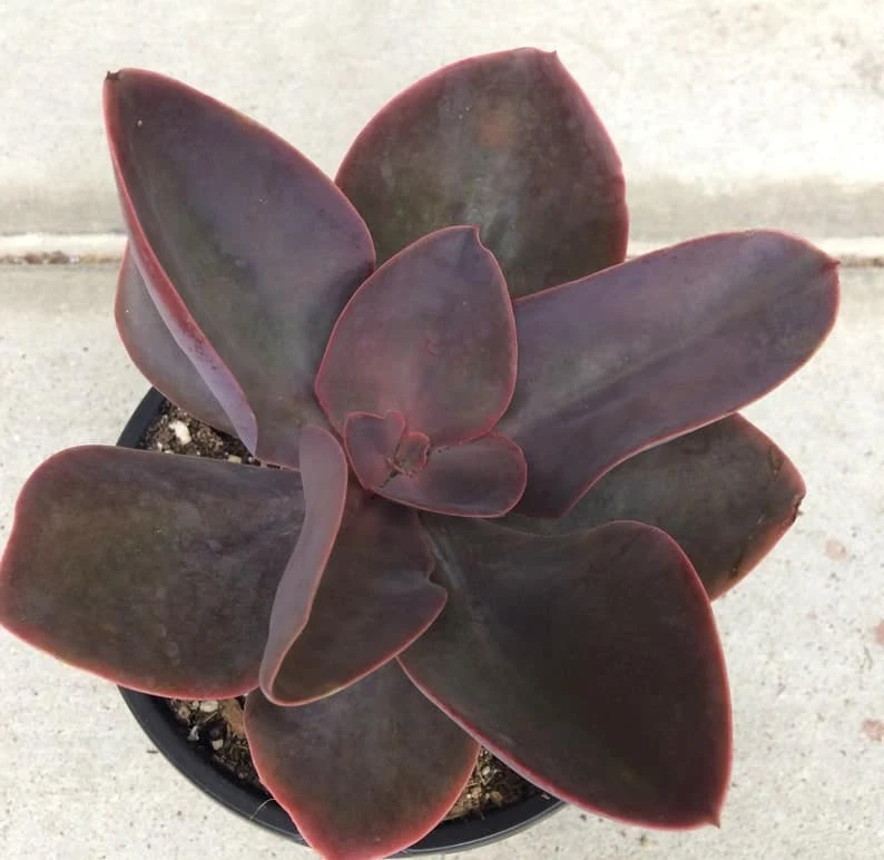 The Echeveria ‘Hortensia’ is a large, mature succulent. It boasts an incredibly dark Echeveria. The dark burgundy coloring make this a standout succulent in any setting. It has fleshy leaves and produces bell shaped blooms. This is a very large hybrid that has a limited availability. A must have for the serious succulent fan.