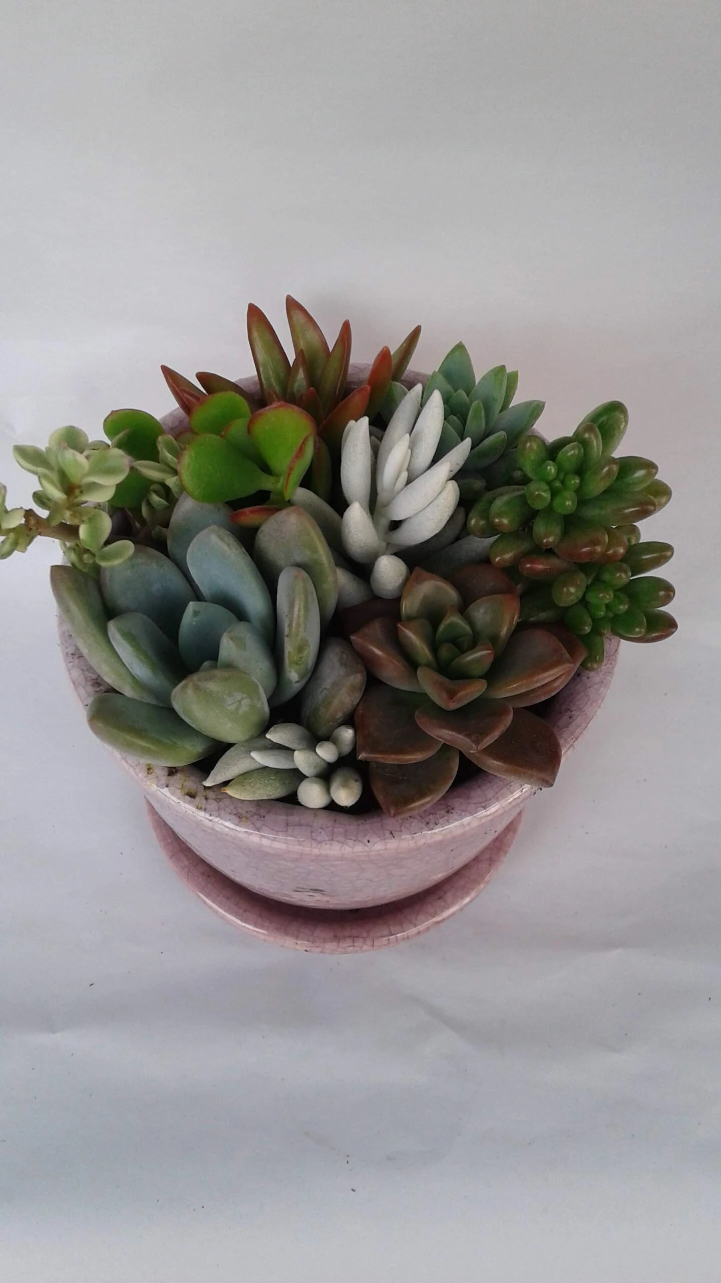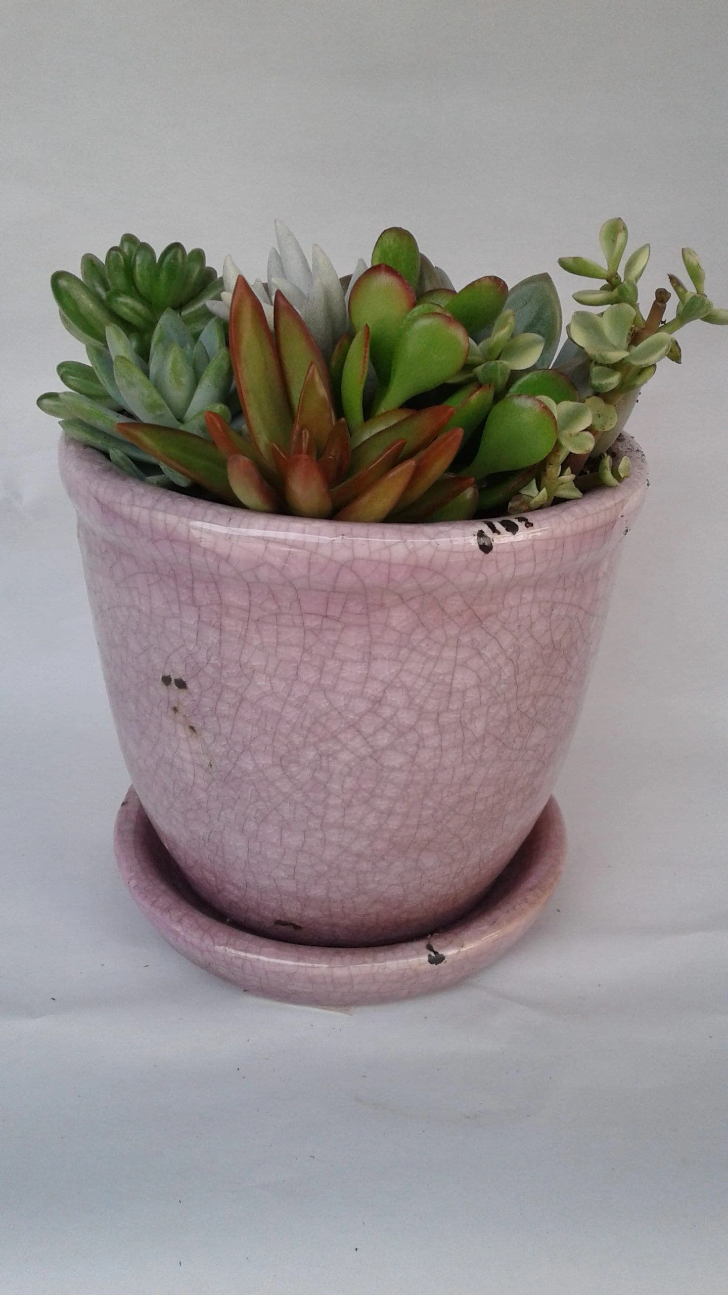 This is a beautiful, completely assembled medium dish garden. This arrangement is an assortment of a variety of succulents in a beautiful Violet/Pink Crackle Ceramic Glazed Planter with attached Drip Saucer. This dish garden is a wonderful Mother’s Day Gift, housewarming gift, hostess gift, a get well wish, a table centerpiece or a gift to yourself. It comes as shown, or with similar plants, depending on the season and availability. It measures 5″ tall with a 4’5″ diameter. These dish gardens are unique as they come as shown and no assembly is required. It is already complete, for you to enjoy! If this is being sent as a gift, please include whatever greeting or message you would like enclosed. A complete care sheet will be included. If you are ordering with temperatures of 34 degrees or less, please consider ordering a heat pack. You will receive one complete Violet/Pink Crackle Ceramic Glazed Planter with Attached Drip Saucer Planter fully assembled. It will be carefully wrapped for shipping and shipped via USPS Priority Mail. Please allow 7 days from placing your order for shipment.