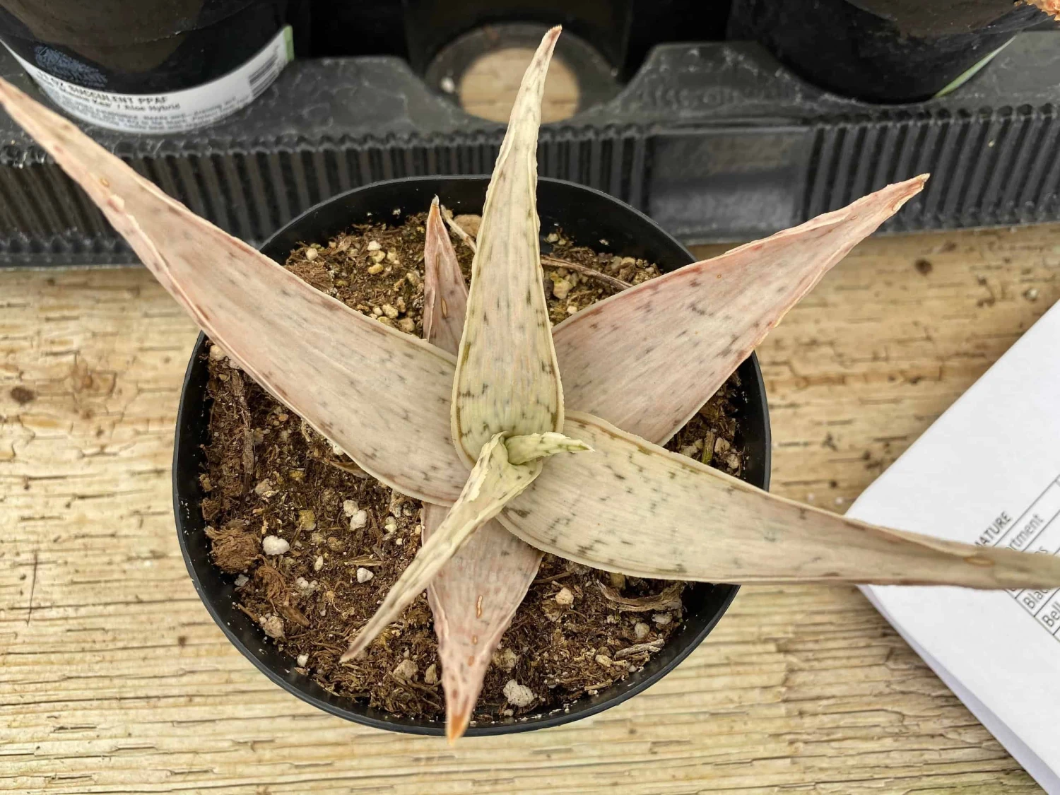 The Medium Star Aloe ‘Snow Drift’ is a beautiful Aloe that blends muted, earth toned colors. This Aloe has snowy coloring and very defined, star shape, with unusual leaf margins that are smooth. It has no spines or sharp edges. This Hybrid will bloom year round if kept warm. It can reach 10″ in height and 10″ in width, making it quite impressive. Needs porous, well draining soil. Water when soil is completely dry to the touch. It likes full to partial sun. Protect from freezing to avoid possible scarring.n nYou will receive 1 well-established, rooted plant, from a 4 inch pot, sent bareroot and packaged with great care. It will be shipped via USPS Priority mail. If you are ordering from an area with weather below 32 degrees, please consider purchasing a heat pack