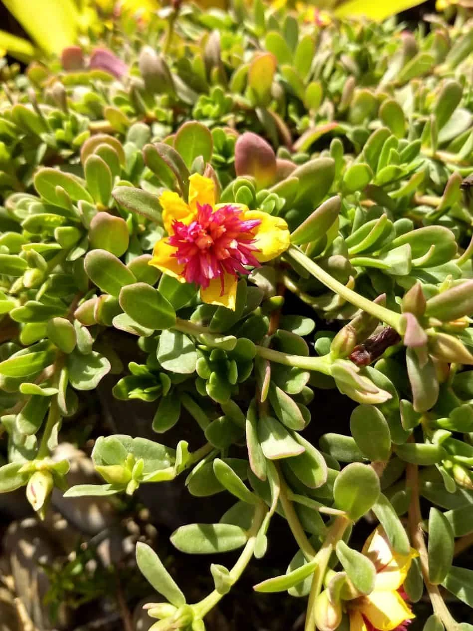 - Offer includes one (1) mature blooming plant fully rooted- NOT SKIMPY CUTTINGS. Purslane Morning Sun has a yellow flower with red glowing center the whole plant is edible.
