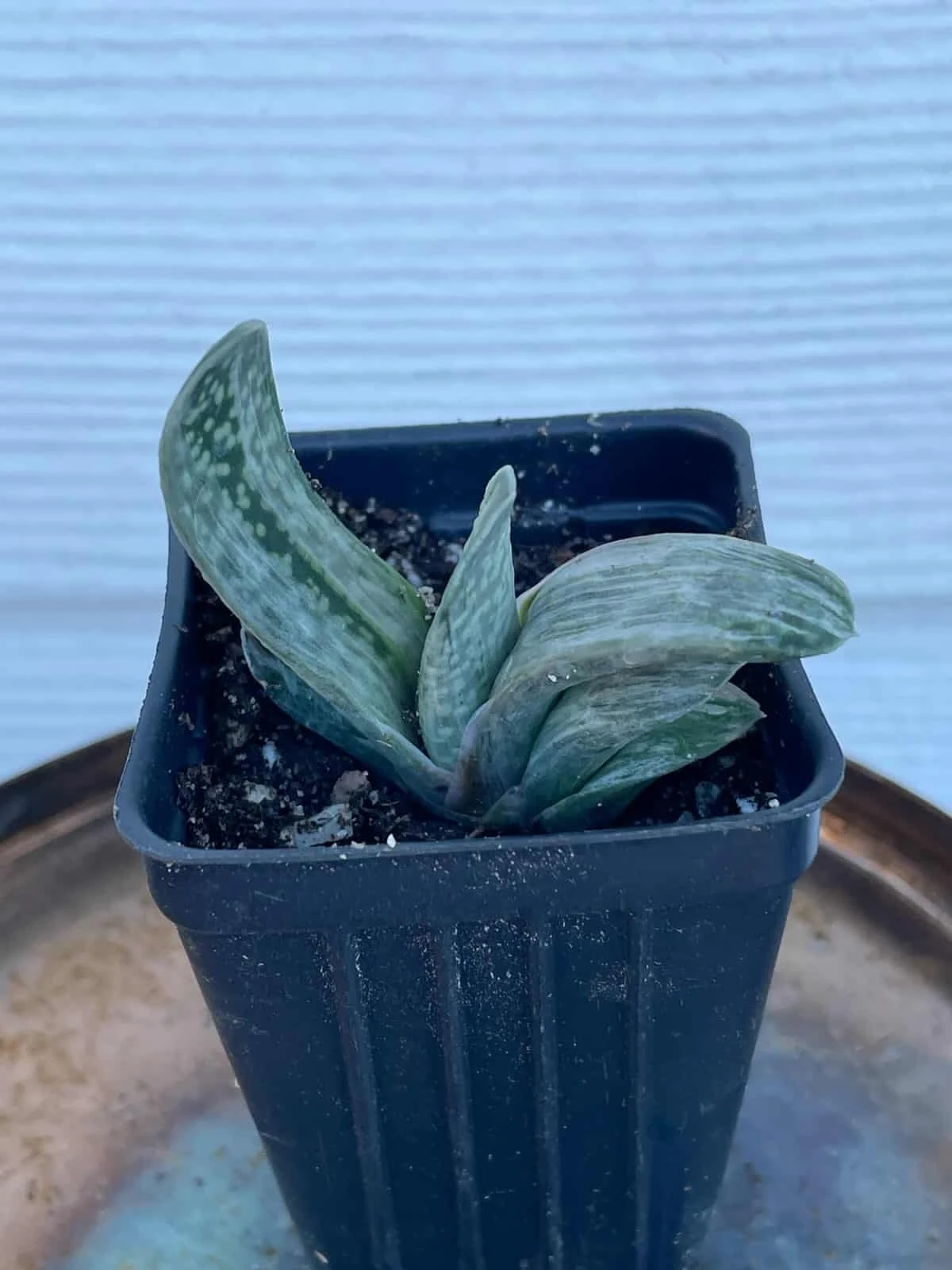 Gasteria ‘Sakura Fuji’ is a Japanese cultivar. It is a very attractive and desirable which should be in everyone gasteria collection. Leaves are thick and fleshy, tightly bunched, stacked, tongue-shaped, emerging from a center and fan out in opposing directions instead of forming a traditional rosette shape. Leaves are striated with tones of deep green, light green, gray, and white. A mature plants will reach a height of approximately 6 inches.