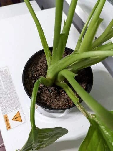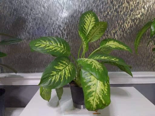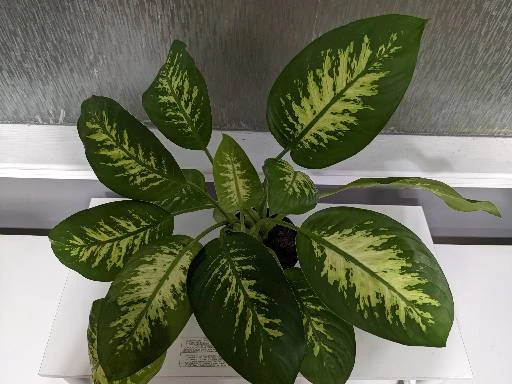 Gorgeous Tropic Snow Dieffenbachia. Since it is still putting out new leaves I give it a cap full of Liqui-dirt with every watering. Bottom water about every 3 weeks. I bet you can tell I did not rotate this one. I had this one placed against a mirror. Moved to a table 3 feet away from window.